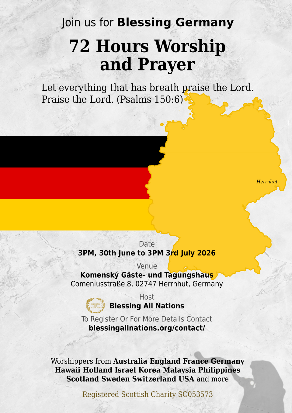 We are thrilled to announce that pre-registration is now open for our upcoming event, Blessing Germany 2026 from 30th June to 3rd July! Join us for 72 hours of worship and prayer over Germany in Herrnhut. By sharing your information, you’ll help us keep you updated on all the details as they become available, ensuring you don’t miss a thing. Register your interest and be part of something special!
